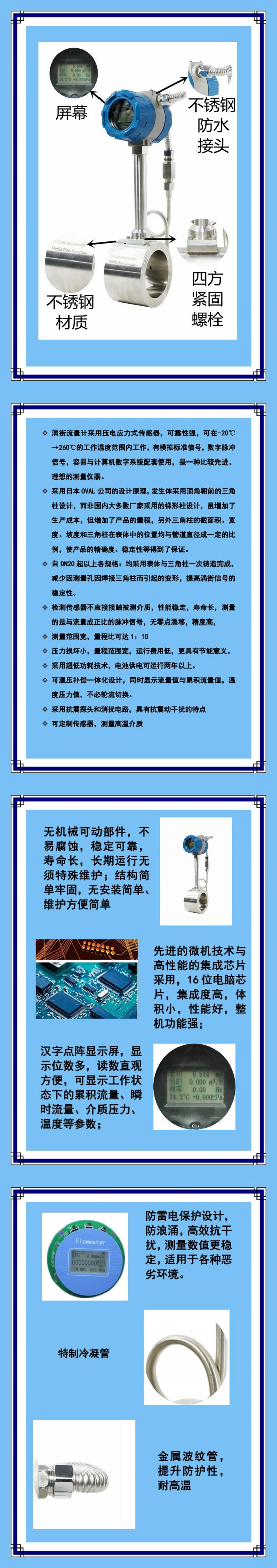 渦街流量計也稱之為旋渦流量計或卡門渦街流量計。本公司渦街流量計是精心設計的產品,實現了產品智能化、標準化、系列化、通用化、生產模具化等要求,產品質量優秀,外形美觀。該系列產品具有電路先進、功耗低、量程比寬、結構簡單、阻力損失小、堅固耐用、用途廣、使用壽命長、工作穩定、便于安裝調試等優勢特點。